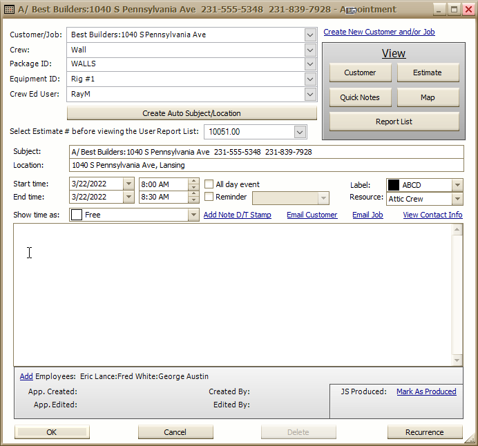 Easily create appointments for existing jobs and have instant access to their Customer, Job, Estimate, Notes, Maps, and Reports, all directly from the calendar.