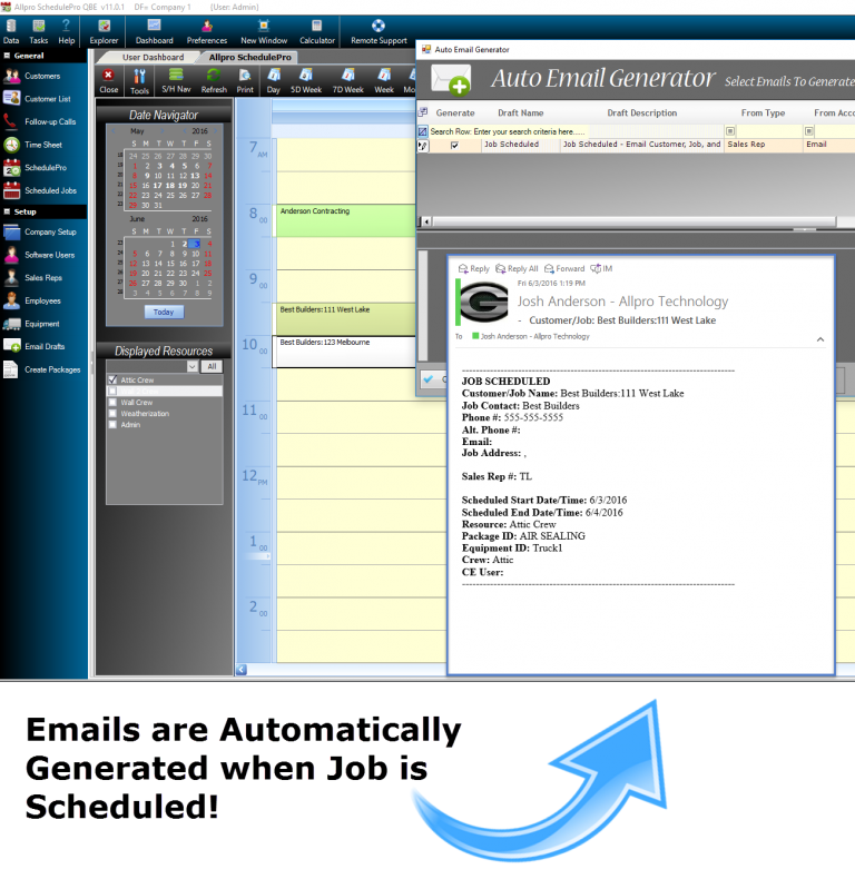 The Email Drafts feature of Allpro SchedulePro allows users to set up triggered emails any time a job is schedule or re-scheduled. Email Reminders can also be sent out via the Scheduled Jobs Form for a specific date range. These features add an entire new level of customer interaction to your business and all while keeping it simple. These events can be automatically triggered so you do not need to remember to manually send them.